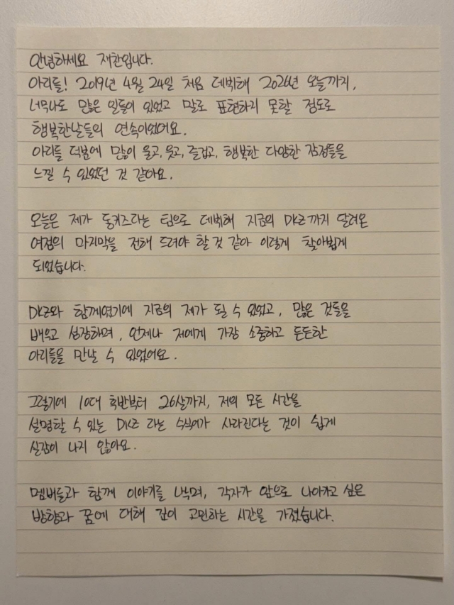 재찬은 "DKZ와 함께였기에 지금의 제가 될 수 있었고, 많은 것들을 배우고 성장하며, 언제나 저에게 가장 소중하고 든든한 아리(팬)들을 만날 수 있었다"라고 팀에 대한 애정을 내비쳤다.