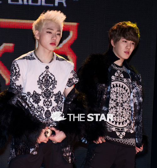 그룹 블락비 지코, 박경(왼쪽부터)이 1일 오후 서울 청담동 일지아트홀에서 열린 두번째 미니앨범 발매 기념 기자간담회에 참석해 취재진을 향해 포즈를 취하고 있다.