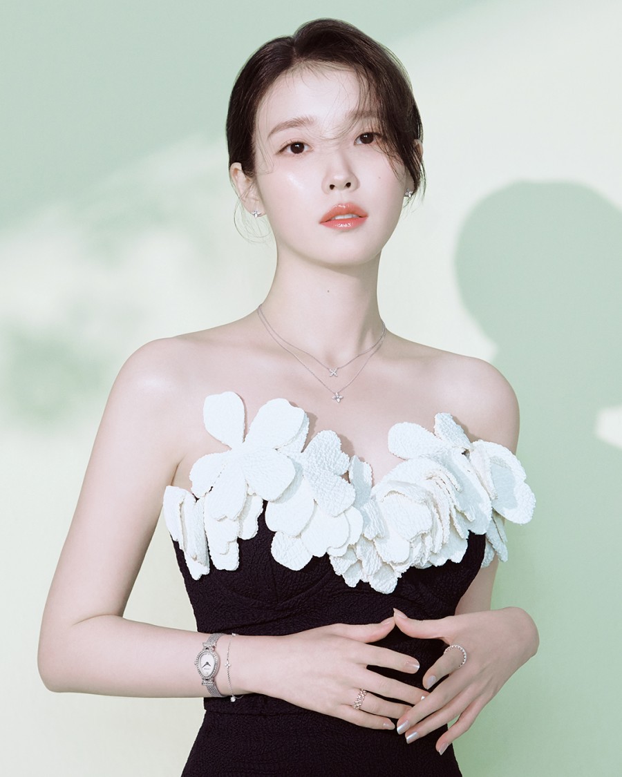 아이유는 싱그러운 그린 톤의 드레스에 반짝이며 흔들리는 꽃잎을 형상화한 골드 목걸이와 꽃잎의 잔잔한 움직임을 표현한 귀걸이를 함께 매치하여 봄의 요정을 연상케 하는 신비로운 비주얼을 완성했다.