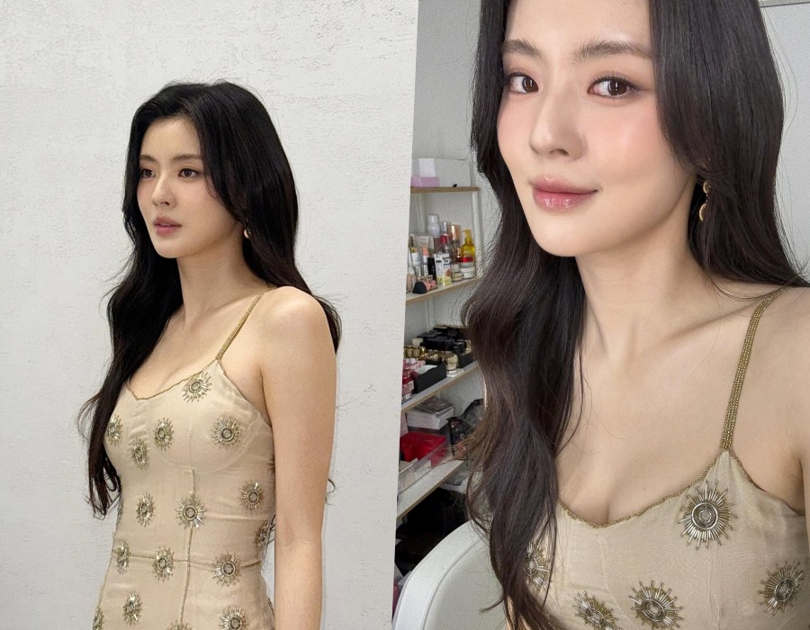 공개된 사진 속 이선빈은 몸선을 따라 부드럽게 흐르는 크림 베이지 컬러의 슬립 드레스를 입고 등장한다. 얇은 스트랩과 정교한 골드 자수 장식이 전체 룩을 감싸며 은은하게 빛난다. 여기에 웨이브진 흑발이 자연스럽게 흘러내리며 얼굴선을 더욱 또렷하게 잡아준다.