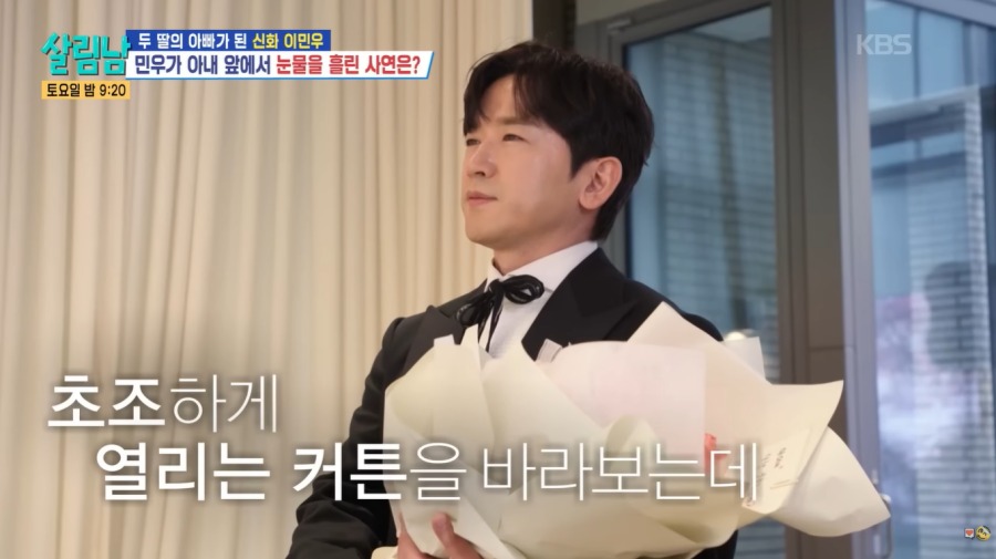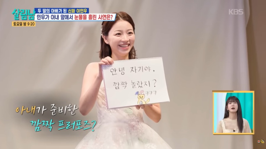 이 가운데 이민우 어머니가 첫째 손녀와 함께 웨딩숍에 찾아왔고, 이민우는 어머니에게 시간 좀 끌어달라고 부탁한 뒤 어디론가 사라졌다. 야심 차게 깜짝 프러포즈를 준비한 이민우는 멋진 턱시도로 갈아입은 후 꽃다발과 함께 돌아왔다. 곧이어 아내를 가리고 있던 커튼이 열렸는데, 이민우는 눈앞에 펼쳐진 뜻밖의 광경에 입을 다물지 못했다. 아내 또한 첫째 딸과 함께 깜짝 프러포즈를 준비한 것. 이민우 아내는 “나와 딸을 받아줘서 정말 고마워. 내가 오빠를 지켜줄 거야” 등 진심이 가득 담긴 글귀로 마음을 전했다. 만감이 교차해 목이 멘 이민우도 “평생 나와 함께해 줄래?”라며 무릎을 꿇었고, 아내는 밝은 미소로 답해 진한 감동을 자아냈다.